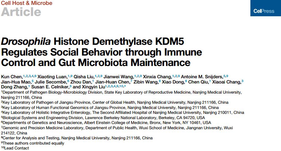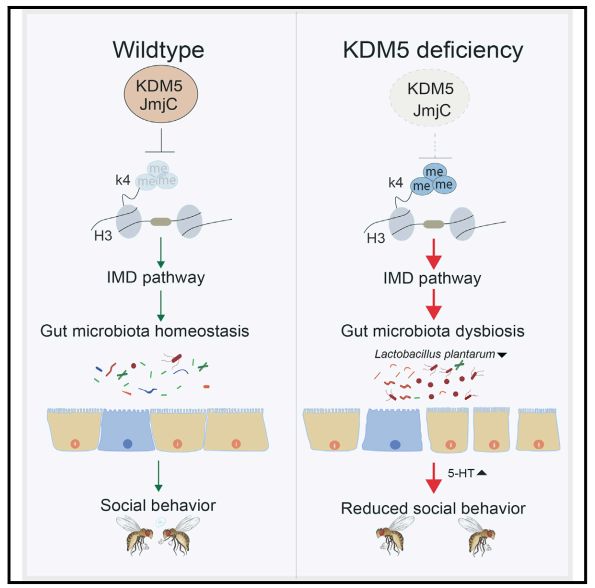 越來越多的研究表明,腸道菌群可以影響智力障礙(ID)和自閉癥譜系障礙(ASD)的疾病癥狀,盡管宿主的基因能夠影響腸道菌群,然而調(diào)控宿主共生菌群穩(wěn)態(tài)的分子機(jī)制在正常和疾病狀態(tài)下仍然未知。KDM5蛋白家族是一種轉(zhuǎn)錄調(diào)控因子,它通過組蛋白H3K4me3去甲基化修飾來發(fā)揮作用,然而在ID和ASD患者中,KDM5A/KDM5B/KDM5C發(fā)生了功能喪失型基因突變。果蠅的腸道菌群結(jié)構(gòu)簡單,遺傳和生理易于操控,可以為宿主-微生物的互作研究提供良好的體系,此外攜帶與人類KDM5C(kdm5A512P)致病錯義突變類似等位基因的果蠅表現(xiàn)出學(xué)習(xí)和記憶缺陷。與腸內(nèi)共生菌接觸的腸上皮細(xì)胞能夠細(xì)菌信號產(chǎn)生活性氧,劉老師課題組的前期研究發(fā)現(xiàn),KDM5能夠調(diào)節(jié)果蠅的細(xì)胞氧化應(yīng)激,因此本研究旨在探究KDM5通過調(diào)節(jié)腸道菌群來影響果蠅社交行為的機(jī)制。