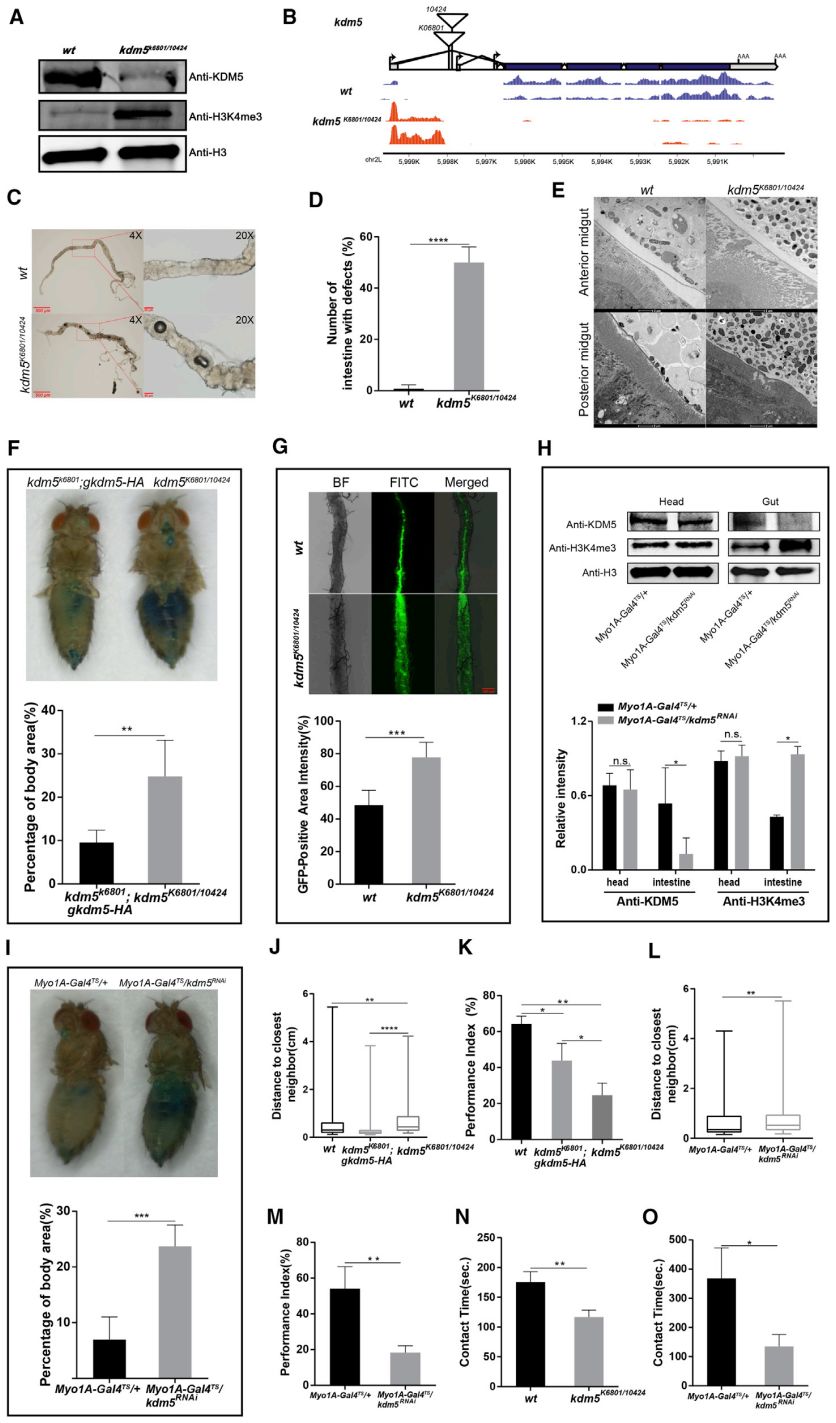 ?圖1. ?A:野生型(wt, w1118)和基因敲除型(kdm5K6801/10424)果蠅的KDM5, H3K4me3和組蛋白H3水平(Western blot);B:wt和kdm5K6801/10424果蠅腸道組織KDM5轉(zhuǎn)錄水平(RNA-seq);C:wt和kdm5K6801/10424果蠅消化道影像,紅框內(nèi)的斑點指示有腸道缺陷(氣泡);D:3-5齡wt和kdm5K6801/10424果蠅的腸道缺陷(氣泡)比例;E:透射電鏡觀察wt和kdm5K6801/10424果蠅前、后中腸上皮屏障;F:藍(lán)色食用染料標(biāo)記、測量wt和kdm5K6801/10424果蠅的腸滲透性;G:異硫氰酸熒光素(FITC)標(biāo)記的玻璃粉指示kdm5K6801/10424果蠅消化道滲透性較高;H:Myo1A-Gal4 TS/+和Myo1A-Gal4 TS/kdm5RNAi果蠅的頭、腸組織的KDM5, H3K4me3和組蛋白H3水平(Western blot);I:藍(lán)色食用染料標(biāo)記、測量Myo1A-Gal4TS/+和Myo1A-Gal4 TS/kdm5RNAi果蠅的腸滲透性;J、K和N:與wt果蠅相比,kdm5K6801/10424果蠅的接觸距離變遠(yuǎn)、交往活躍度下降、雌性社交接觸時間變短;L、M和O:與Myo1A-Gal4 TS果蠅相比,Myo1A-Gal4 TS/kdm5RNAi果蠅也發(fā)生了接觸距離變遠(yuǎn)、社交活躍度下降、雌性交往接觸時間變短。