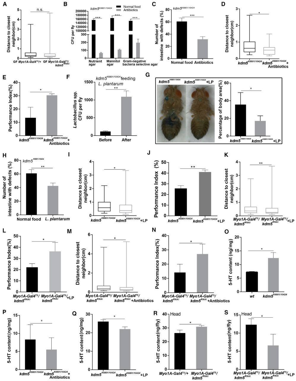 圖4. A:無菌Myo1A-Gal4 TS/+和Myo1A-Gal4 TS/kdm5RNAi果蠅的接觸距離比較;B:3種培養(yǎng)基(營養(yǎng)物瓊脂、甘露糖瓊脂和革蘭氏陰性菌瓊脂)培養(yǎng)的標(biāo)準(zhǔn)日糧和抗生物添加日糧對kdm5K6801/10424果蠅腸道致病菌數(shù)量(CFU/只)的影響;C-E:標(biāo)準(zhǔn)日糧和植物乳桿菌對kdm5K6801/10424果蠅的腸道缺陷(氣泡)、接觸距離和社交活躍度的影響;F-J:標(biāo)準(zhǔn)日糧和植物乳桿菌(L. plantarum L168)添加日糧對kdm5K6801/10424果蠅的植物乳桿菌(L. plantarum L168plantarum L168Lactobacillus spp.)數(shù)量(CFU/只)、腸滲透性、腸道缺陷(氣泡)、接觸距離和社交活躍度的影響;K-L:標(biāo)準(zhǔn)日糧和乳酸菌(Lactobacillus spp.)添加日糧對Myo1A-Gal4 TS/kdm5RNAi果蠅的接觸距離和社交活躍度的影響;M-N:標(biāo)準(zhǔn)日糧和抗生素添加日糧對Myo1A-Gal4TS/kdm5RNAi果蠅的接觸距離和社交活躍度的影響;O-S:5-羥色氨(5-HT)分別在wt與kdm5K6801/10424果蠅、標(biāo)準(zhǔn)日糧與抗生物添加日糧飼養(yǎng)的kdm5K6801/10424果蠅、標(biāo)準(zhǔn)日糧與乳酸菌(Lactobacillus spp.)添加日糧飼養(yǎng)的kdm5K6801/10424果蠅、Myo1A-Gal4 TS/+與Myo1A-Gal4 TS/kdm5RNAi果蠅、標(biāo)準(zhǔn)日糧與乳酸菌(Lactobacillus spp.)添加日糧飼養(yǎng)的Myo1A-Gal4 TS/kdm5RNAi果蠅組間的濃度(ng/mg)比較。