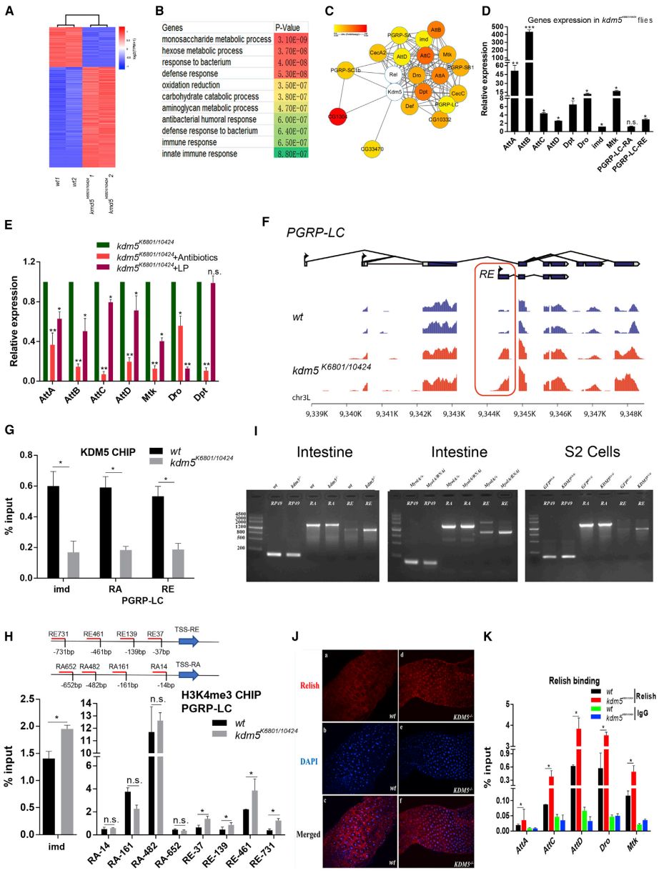 圖5. A-C:wt和kdm5K6801/10424果蠅腸道組織差異表達(dá)基因的分層聚類分析、GO富集分析和蛋白互作網(wǎng)絡(luò)分析;D:與wt果蠅相比,kdm5K6801/10424果蠅腸道組織的抗菌和先天免疫反應(yīng)基因相對表達(dá)(RT-PCR);E:與kdm5K6801/10424果蠅相比,飼喂植物乳桿菌(L. plantarum L168)和抗生素日糧的kdm5K6801/10424果蠅腸道組織的抗菌和先天免疫反應(yīng)基因相對表達(dá);F:wt和kdm5K6801/10424果蠅腸道組織的PGRP-LC基因結(jié)構(gòu)和轉(zhuǎn)錄模式;G-H:wt與kdm5K6801/10424果蠅腸道組織imd、PGRP-LC-RA、PGRP-LC-RE基因啟動子區(qū)域的KDM5水平和H3K4me3水平分析(ChIp-qPCR);I:kdm5K6801/10424和Myo1A-Gal4 TS/kdm5RNAi果蠅腸道組織,以及S2細(xì)胞的全長PGRP-LC-RA和PGRP-LC-RE表達(dá)分析(RT-PCR);J:wt和kdm5K6801/10424果蠅腸道組織的Relish免疫熒光染色;K:wt和kdm5K6801/10424果蠅腸道組織的Relish基因啟動子區(qū)域的Relish水平分析(ChIp-qPCR)。