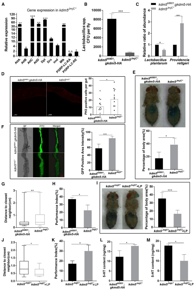 ?圖6. A:與kdm5k6801;gkdm5-HA果蠅相比,3-5日齡kdm5k6801;gkdm5JmjC*-HA(簡稱kdm5Jmjc*)果蠅腸道組織的抗菌和先天免疫反應(yīng)基因的表達(dá)(RT-PCR);B-C:3-5日齡kdm5k6801;gkdm5-HA和kdm5Jmjc*果蠅腸道的乳酸菌(Lactobacillus spp)、植物乳桿菌(L. plantarum L168)、P. rettgeri P6數(shù)量(CFU/只);D:3-5日齡kdm5k6801;gkdm5-HA和kdm5Jmjc*果蠅中腸PH3正染色干細(xì)胞數(shù)目;E:3-5日齡kdm5k6801;gkdm5-HA和果蠅腸滲透性評估;F:異硫氰酸熒光素(FITC)標(biāo)記的玻璃粉指示kdm5Jmjc*果蠅消化道滲透性較高;G-H:kdm5k6801;gkdm5-HA與kdm5Jmjc*果蠅的接觸距離和交往活躍度比較;I-K:標(biāo)準(zhǔn)日糧與植物乳桿菌(L. plantarum L168)添加日糧對kdm5Jmjc*果蠅消化道滲透性、接觸距離和交往活躍度的比較;L:kdm5k6801;gkdm5-HA和kdm5Jmjc*果蠅腹部組織的5-羥色胺(5-HT)濃度比較;M:標(biāo)準(zhǔn)日糧與植物乳桿菌(L. plantarum L168)添加日糧對kdm5Jmjc*果蠅5-HT濃度的影響。