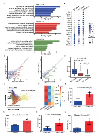 a HSC/MPP三個亞群的GO富集分析。b三種HSC/MPP亞型中富集的DEG的散點圖。c HSC/MPP1與HSC/MPP2(左)與 HSC/MPP3(右)中所有基因表達的散點圖。d箱線圖顯示了三種 HSC/MPP 亞型的 hscScore 分布。e軌跡分析重建HSC/MPP 到淋巴和骨髓祖細胞的譜系分化。f熱圖顯示了三種 HSC/MPP 亞型中HSC/MPP 特征基因和Cd93的表達模式。g使用 CD93 + SLAM-LSK (CD93 + HSC) 和 CD93 – HSC進行初次移植后 8 周受者外周血 (PB) 中供體來源的嵌合體比例。h使用 CD93 + HSC 和 CD93 – HSC進行初次移植后 20 周時受者 PB 中供體來源的嵌合體比例。i在使用 CD93 + HSC 和 CD93 – HSC進行二次移植后 8 周時受者 PB 中的供體來源嵌合體比例。j使用 CD93 + HSC 和 CD93 – HSC進行二次移植后 16 周時受者 PB 中供體來源的嵌合體比例。