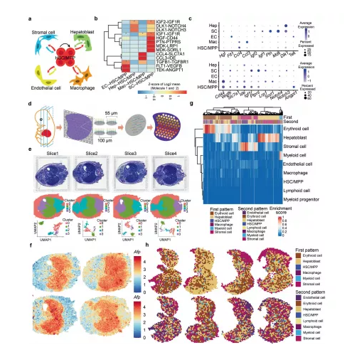 a示意圖展示 HSC/MPP 和生態位細胞(內皮細胞、基質細胞、成肝細胞和巨噬細胞)之間的細胞相互作用。b CellPhoneDB 分析展示主要的 HSC/MPP-生態位細胞相互作用對。c主要的HSC/MPP-生態位細胞相互作用對的配體(頂部)和相應受體(底部)表達模式的散點圖。d 10×Visium ST 實驗流程示意圖。e E14.5 胚胎組織切片的蘇木精和伊紅 (HE) 染色。f組織切片中成肝細胞標記物Afp 的表達模式。g熱圖展示了FL斑點的富集分數。h FL部分空間特征圖。
