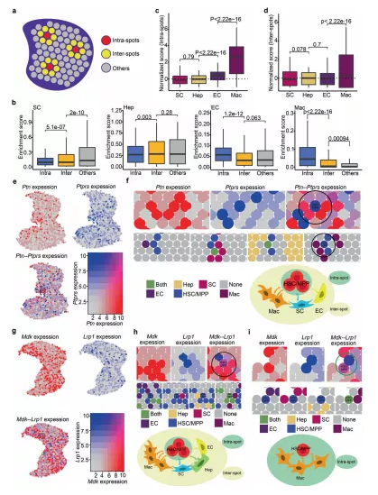 a點內、點間及其他的示意圖。點內:HSC/MPP 定位點;點間:HSC/MPP 包圍點;其他,其他遠端的點。b箱線圖展示點內、點間和其他點中生態位細胞的富集分數。c箱線圖展示了點內生態位細胞的歸一化(富集)評分。d箱線圖顯示點間生態位細胞的歸一化(富集)評分。e FL中Ptn和Ptprs 的共表達模式。f 空間特征圖展示Ptn-Ptprs豐富的 HSC/MPP 擴增單元。基因Ptn在生態位細胞定位點(頂部,紅色點)和基因Ptprs在HSC/MPP 定位點(頂部,藍色點)的表達模式。g FL中Mdk和Lrp1 的共表達模式。h富含Mdk -Lrp1 的HSC/MPP 擴增單元(點間)的空間特征圖。i空間特征圖展示富含Mdk- Lrp1 的HSC/MPP 擴增單元(點內)。