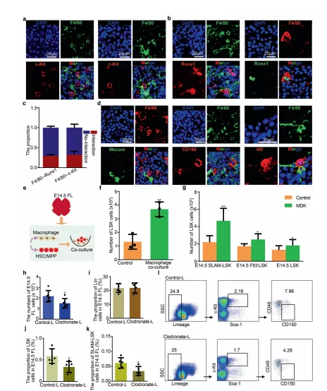 a免疫熒光分析顯示 E14.5 FL 冷凍切片中 F4/80(代表巨噬細胞)和 c-Kit(代表 HSCs/MPPs)的表達。b免疫熒光分析顯示 E14.5 FL 冷凍切片中 F4/80(代表巨噬細胞)和 Runx1(代表 HSCs/MPPs)的表達。C柱狀圖展示有和無細胞相互作用的 HSCs/MPPs 的比例。d免疫熒光分析顯示 E14.5 FL 冷凍切片中 F4/80(代表巨噬細胞)、CD150(代表 HSCs/MPPs)、Mecom(代表 HSCs/MPPs)和 Hlf(代表 HSCs/MPPs)的表達。f源自巨噬細胞和 HSC/MPP 共培養系統的 HSCs/MPPs(LSK 細胞)的數量。g源自MDK補充培養物的 100 個 HSCs/MPPs(LSK、Flt3 -LSK 和 SLAM-LSK 細胞)的HSCs/MPPs(LSK 細胞)的數量。h氯膦酸鹽-脂質體和對照-脂質體處理后 E14.5 FL 中的總細胞數。i氯膦酸鹽處理前后 E14.5 FL中譜系- (Lin- ) 細胞的比例。j氯膦酸鹽處理前后 E14.5 FL 中 LSK 細胞的比例。k氯膦酸鹽處理前后 E14.5 FL 中 SLAM-LSK 細胞的比例。l流式細胞儀分析顯示E14.5 FL在氯膦酸鹽處理前后Lin -,LSK,SLAM-LSK的細胞比例。