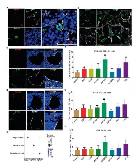 a 免疫熒光分析顯示了在 E14.5 FL 冷凍切片中 Lyve1(代表ECs)和 Runx1(代表 HSCs/MPPs)的表達。b免疫熒光分析顯示了 E14.5 FL 冷凍切片中 Lyve1(代表EC)和 Runx1(代表 HSCs/MPPs)的表達。c免疫熒光分析顯示 E14.5 FL 冷凍切片中 c-Kit(代表 HSCs/MPPs)、Runx1(代表 HSCs/MPPs)和 EphrinB2(代表動脈門脈血管)的表達。d免疫熒光分析顯示 c-Kit(代表 HSCs/MPPs)、Runx1(代表 HSCs/MPPs)和 EphB4(代表靜脈)在 E14.5 FL 冷凍切片中的表達。e Igfbp1、Igfbp5和Igfbp7在三種結構生態位細胞(內皮細胞、基質細胞和成肝細胞)中的表達模式散點圖。f來自 E14.5 FL 的 100 個 SLAM-LSK 細胞因子培養物的 HSCs/MPPs(LSK 細胞)的數量。g來自 E14.5 FL的 100 個Flt3-LSK 細胞因子培養物的 HSCs/MPPs(LSK 細胞)的數量。h來自 E14.5 FL 的 100 個 LSK 細胞因子培養物的 HSCs/MPPs(LSK 細胞)的數量。