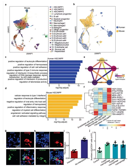 a E14.5 FL中所有細胞類型的UMAP 可視化。b來自小鼠(E14.5)和人類(受孕后 11 周)的 FL 細胞群的 UMAP 可視化。c對人類 HSCs/MPPs中top DEG 進行 GO 生物過程相關的通路富集分析。d對小鼠 HSCs/MPPs 中top DEG進行GO生物過程相關的通路富集分析。e配體-受體相互作用網絡展示了人 HSC/MPP與生態位細胞之間的潛在通訊網絡。f熱圖展示主要的人 HSCs/MPPs-生態位細胞相互作用對。g – h免疫熒光分析展示CD68(代表巨噬細胞)和 CD34(代表 HSCs/MPPs)在人受孕后第 11 周 FL 切片中的表達。i柱狀圖展示有和無細胞相互作用的 HSCs/MPPs 所占的比例。j源自小鼠巨噬細胞和 HSCs/MPPs 共培養系統的人 CD34 + HSCs/MPPs的數量。