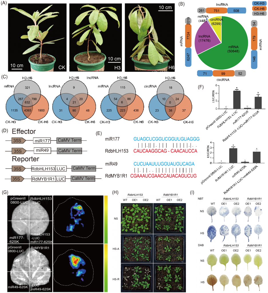圖2. miRNA和靶基因的全轉錄組分析及功能驗證 (A)R. delavayi的對照(CK)和熱處理(H3和H6);(B)mRNA、lncRNA、miRNA和circRNA的鑒定和差異表達分析;(C)三種比較中特異性和常見的差異表達RNA;(D)效應器和報告器結構圖;(E)miR49和miR177靶點突變示意圖;(F)熒光素酶測定統(tǒng)計。誤差條表示三個重復的SEs(*,p?< 0.05)。(G)熒光素酶成像分析;(H)RdbHLH153和RdMYB1R1的過表達增強了耐熱性。NS表示無熱應激,HS-A表示36 h熱應激,HS-R表示36 h熱處理后在常溫下恢復5天;(I)二氨基聯苯胺(DAB)和硝基藍四氮唑(NBT)染色法檢測轉基因株系和WT在無熱脅迫(NS)和熱脅迫(HS)下的H2O2和O?2。