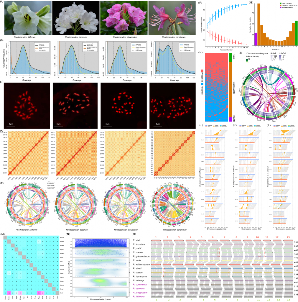 圖 1. 4種杜鵑屬及11種已發(fā)表杜鵑屬植物的基因組分析 (A)四種杜鵑花的開花照片;(B)通過k-mer進行基因組調查。(C)流式細胞術檢測染色體核型;(D)基因組組裝的Hi-C接觸圖;(E)轉座子、SSR、基因密度和GC含量在染色體上的分布;(F)核心(紅色)和非核心(藍色)基因家族數量趨勢圖;(G)核心集群、可有可無集群和私有集群的家族數量;(H)核心、可有可無和私有集群的存在和缺失分析;(I)百合杜鵑花基因組中基因密度、SNP和InDel變異的分布情況;(J-L)以T2T基因組為參照,研究了端粒紅豆杉、鴨嘴獸和短柄紅豆杉基因組的同源性和重排;(M)兩個物種之間共享LTR的比例(Rconc:?R. concinnum; Rdeco:?R. decorum; Rdela:?R. delavayi; Rgrie:?R. griersonianum; Rhena:?R. henanense; Rirro:?R. irroratum; Rlili:?R. liliiflorum; Rmoll:?R. molle; Rovat:?R. ovatum; Rplat:?R. platypodum; Rprat:?R. prattii; Rripe:?R. ripense; Rsims:?R. simsii; Rvial:?R. vialii; Rwill:?R. williamsianum);(N)LTR在染色體上的分布。x軸代表染色體位置的百分比,y軸代表LTR的插入時間;(O)15種杜鵑屬植物的基因組共線性。右邊的數字表示共線塊編號。