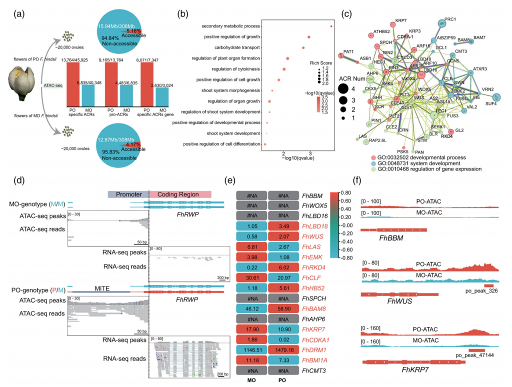 先前的研究表明,一個(gè)顯性基因FhRWP決定了與微型倒重復(fù)轉(zhuǎn)座因子(MITE)插入相關(guān)的不定胚胎的啟動(dòng),在PO基因型中FhRWP的啟動(dòng)子區(qū)中鑒定到了特異性ACR,而Mo基因型中不含ACR,該ACR與FhRWP啟動(dòng)子區(qū)域的MITE序列重疊,即MITE序列被FhARID1蛋白結(jié)合,這可能是染色質(zhì)重塑復(fù)合體的一個(gè)亞基,這些結(jié)果表明,F(xiàn)hRWP是可及染色質(zhì)的決定因素,參與不定胚胎發(fā)育,與MITE的插入有關(guān)。