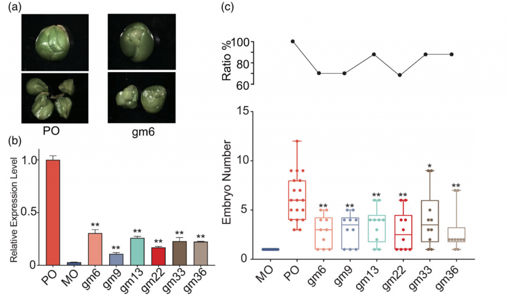FhRWP基因在胚囊中的表達(dá)是特異性和短暫的,可以從受精前7天開始追蹤,直到后10天,作者采用RNAi方法構(gòu)建了6個(gè)干擾系,發(fā)現(xiàn)FhRWP在6個(gè)干擾系中的表達(dá)量相比PO系顯著降低,但顯著高于Mo基因型,且FhRWP表達(dá)量降低后不定胚數(shù)量也都減少了,這些結(jié)果提示,受FhRWP控制的不定胚表型可能與基因表達(dá)的劑量效應(yīng)有關(guān)。