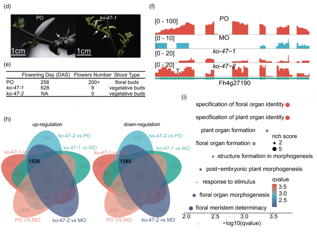 作者之前的研究顯示的雜合子插入MITE啟動(dòng)子區(qū)域和一個(gè)FhRWP的CDS序列區(qū)域SNP(C-G),導(dǎo)致這個(gè)基因的分裂成兩個(gè)單倍型,M等位基因(MITE)和P等位基因(沒有MITE)。根據(jù)Mo和PO腋芽的轉(zhuǎn)錄組結(jié)果,作者發(fā)現(xiàn)PO中RWP轉(zhuǎn)錄本高表達(dá)P等位基因,而Mo中M等位基因表達(dá)較小,于是作者構(gòu)建了CRISPR/Cas9載體,以敲除FhRWP,結(jié)果表明,插入MITE可以通過促進(jìn)含有MITE的P等位基因的表達(dá),同時(shí)減少不插入MITE的M等位基因的表達(dá),從而改變?cè)摶虻谋磉_(dá)模式。雖然FhRWP在ko-47-1和ko-47-2中的FhRWP的表達(dá)下降到與Mo一致的水平,但P等位基因突變導(dǎo)致的過早終止導(dǎo)致了FhRWP功能的喪失,因此,ko-47-1和ko-47-2植株表現(xiàn)出新的表型,如生長(zhǎng)遲緩和花芽分化失敗。