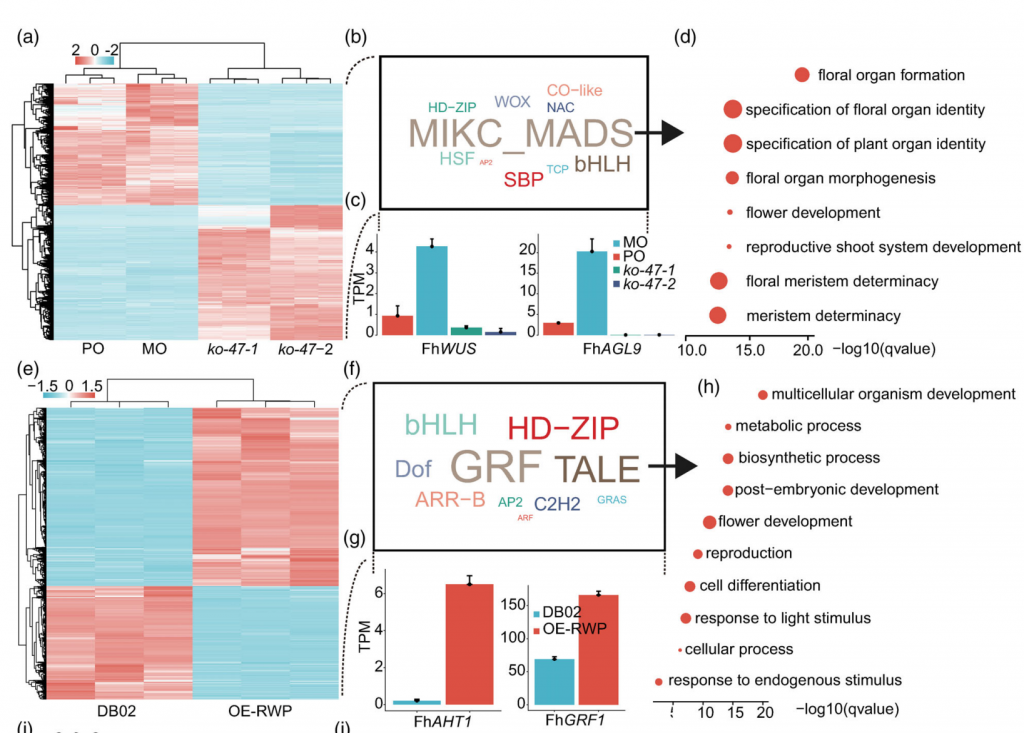 多項(xiàng)實(shí)驗(yàn)結(jié)果表明,F(xiàn)hRWP在協(xié)調(diào)細(xì)胞命運(yùn)和啟動(dòng)植物再生和繁殖過程中起著關(guān)鍵作用,因此,該研究對(duì)腋芽MO/PO胚珠的表達(dá)數(shù)據(jù)進(jìn)行了整合的轉(zhuǎn)錄組分析。差異基因在花器官發(fā)生和繁殖相關(guān)的生物過程顯著富集,其中來自MADS和WOX等基因家族的轉(zhuǎn)錄因子,包括FhWUS和FhAGL6,均顯著富集,在過表達(dá)的愈傷組織中,共鑒定出354個(gè)差異表達(dá)的轉(zhuǎn)錄因子,GO注釋顯示與胚胎后發(fā)育和再生相關(guān)的過程顯著相關(guān)。值得注意的是,屬于GRF和TALE等基因家族的轉(zhuǎn)錄因子,包括FhAHT1和FhGRF1,表現(xiàn)出顯著的富集,這些基因已被廣泛報(bào)道參與光形態(tài)建成、葉片發(fā)育等信號(hào)通路。