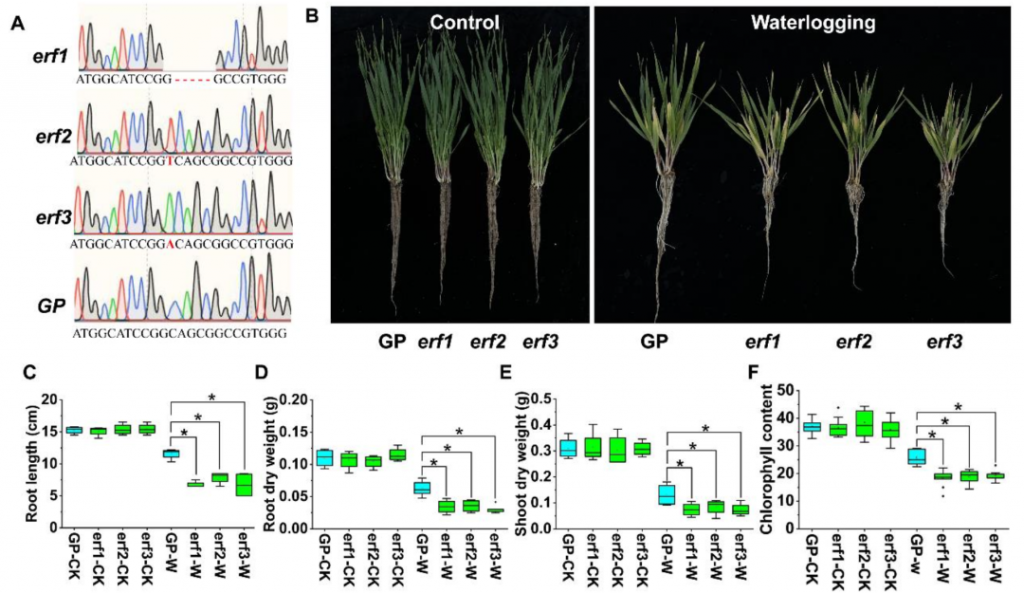 利用CRISPR/Cas9基因編輯技術(shù),獲得了3個(gè)獨(dú)立的 HvERF62 純合突變體(erf1、erf2、erf3)。這些突變體在正常條件下與野生型(GP)的生長(zhǎng)發(fā)育沒(méi)有顯著差異。然而,在漬澇脅迫下,突變體的不定根數(shù)量顯著少于野生型,且根長(zhǎng)、地上部干重、根干重和葉綠素含量均顯著低于野生型(圖4B-4F)。
