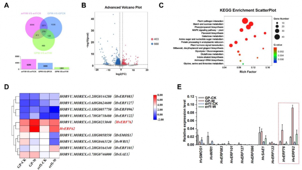 對(duì)野生型和 HvERF62 突變體進(jìn)行轉(zhuǎn)錄組測(cè)序分析。結(jié)果顯示,在漬澇脅迫下,突變體中有403個(gè)基因上調(diào)表達(dá),888個(gè)基因下調(diào)表達(dá)(圖5A, 5B)。KEGG富集分析表明,這些差異表達(dá)基因顯著富集在植物-病原互作、淀粉和蔗糖代謝、苯丙烷類生物合成、MAPK信號(hào)通路、植物激素信號(hào)轉(zhuǎn)導(dǎo)、糖酵解/糖異生等通路中(圖5C)。