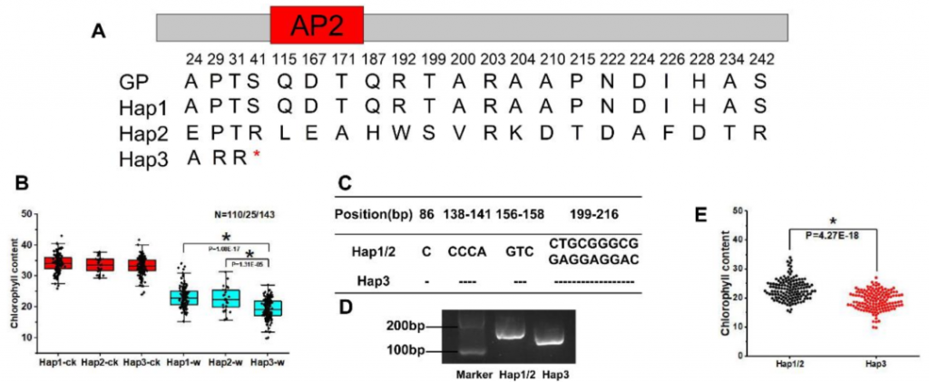 對(duì)自然群體中 HvERF62 基因的序列進(jìn)行分析,發(fā)現(xiàn)存在43個(gè)SNPs和4個(gè)InDels。根據(jù)這些變異,將種質(zhì)資源分為3個(gè)單倍型(Hap1、Hap2和Hap3)。其中,Hap3由于序列變異導(dǎo)致編碼提前終止。在漬澇脅迫下,Hap1和Hap2的葉綠素含量顯著高于Hap3(圖10A, 10B)?;贗nDel變異設(shè)計(jì)的分子標(biāo)記可用于區(qū)分不同單倍型(圖10C-10E)。