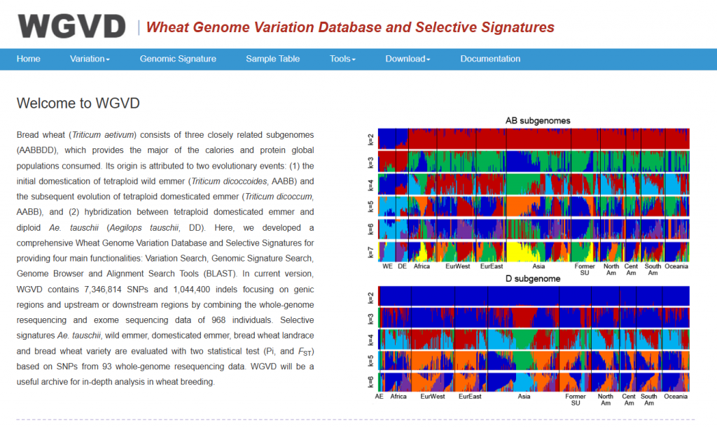 ☆?小麥基因組變異與選擇信號數(shù)據(jù)庫WGVD:匯總了從968個面包小麥及其祖先中收集到的SNPs、indels,以及基于93個小麥全基因組重測數(shù)據(jù)的SNPs評估的小麥馴化和改良過程中的選擇特征。數(shù)據(jù)庫主要提供變異、基因組選擇信號搜索、基因組瀏覽和比對功能。