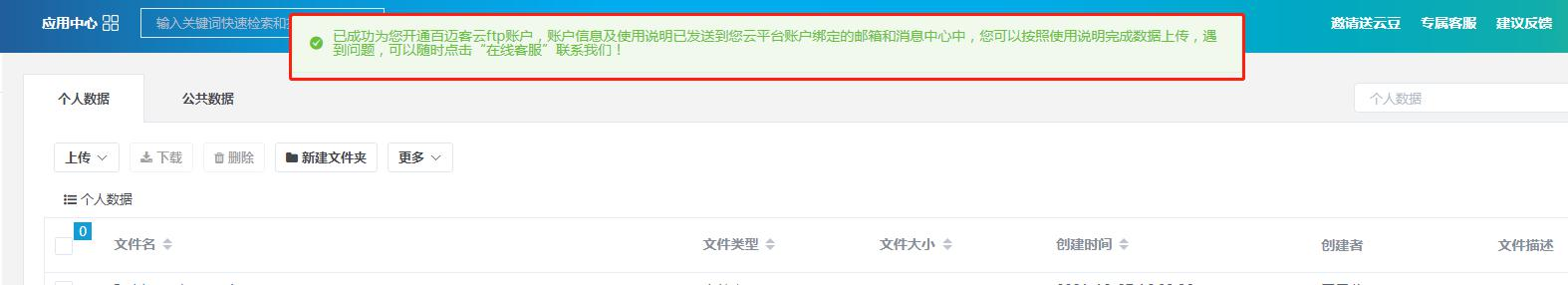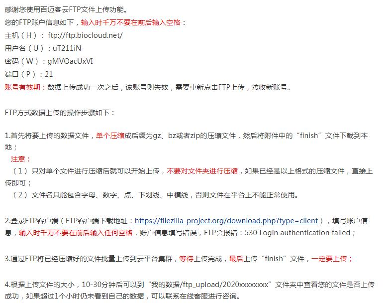 FTP 上傳:數據量大于 200M 時使用 FTP 上傳數據。選擇“FTP 上傳”后彈出提示對話框,點擊“確定”后系統會自動創建一次性的 FTP 賬戶,用于本次數據上傳。賬戶信息會發送至注冊郵箱及平臺的“個人中心——消息中心”中。依照提示操作即可。