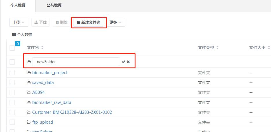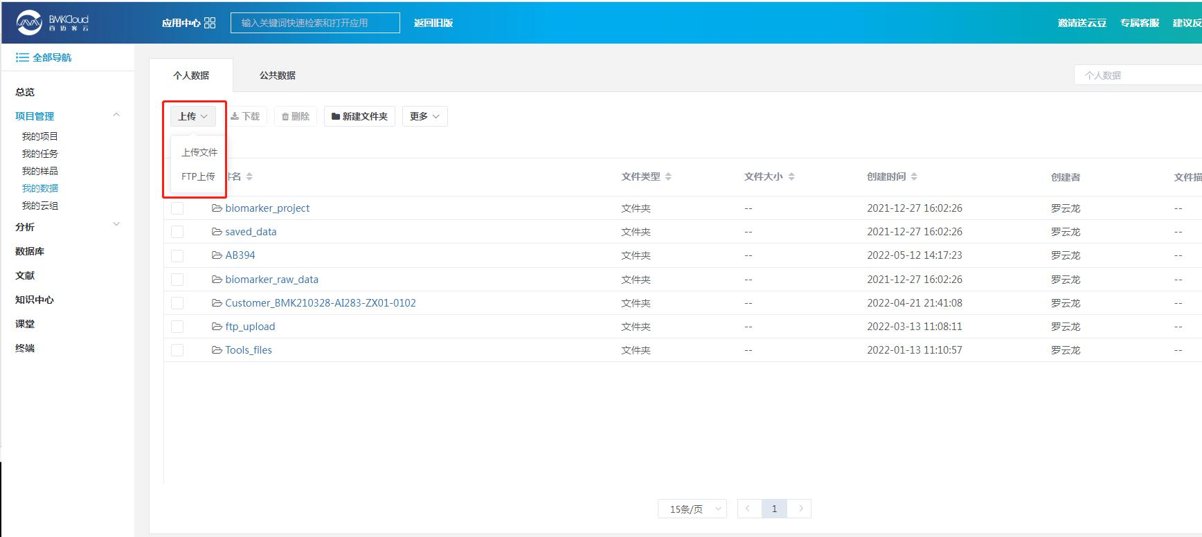 2、在我的數據中,建議新建文件夾后,進入新文件夾,點擊“上傳”,選擇上傳文件或 FTP 上傳。