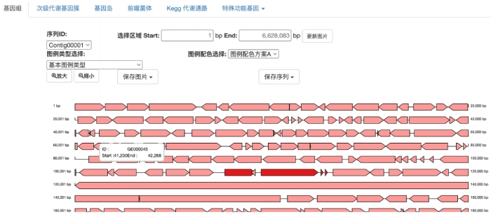 云平臺內(nèi)置【基因組圖譜展示工具】,點(diǎn)擊即可查看基因組環(huán)形圖、基因位置分布等信息,直觀掌握基因組結(jié)構(gòu)(示意圖如下)
