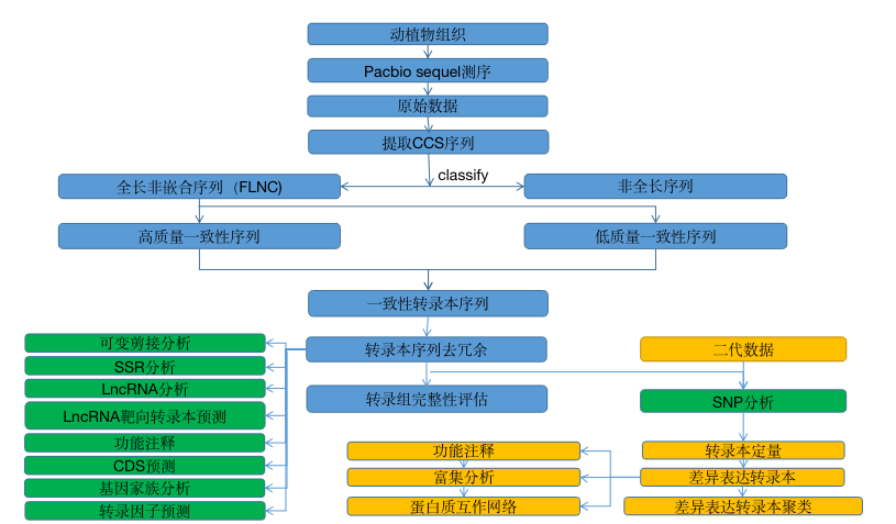 全長轉(zhuǎn)錄組研究是理解生物機(jī)體功能的一個(gè)重要途徑。傳統(tǒng)二代轉(zhuǎn)錄組測序無法直接獲得單個(gè)RNA分子由5ˊ到3ˊ的全部序列。基于PacBio三代測序平臺的轉(zhuǎn)錄組研究,無需打斷,直接讀取反轉(zhuǎn)錄的全長cDNA,能夠有效的獲取高質(zhì)量的單個(gè)RNA分子的全部序列,準(zhǔn)確辨別二代測序無法識別的同源異構(gòu)體(isoform)、同源基因、超家族基因或等位基因表達(dá)的轉(zhuǎn)錄本。