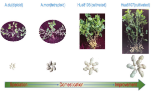 充分注釋了高質量野生四倍體花生基因組,揭示了花生亞基因組單系起源和遺傳進化模型,表明了野生和栽培四倍體花生亞基因組發生了不對稱進化;此外,野生花生中存在的獨特等位基因可以改善栽培花生的抗性和莢果大小等形狀,為研究多倍體基因組進化、作物馴化和基因組輔助花生生產改良提供獨特的價值。