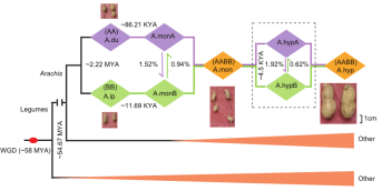 栽培花生和野生花生的亞基因組間的同源序列交換率(HSE)分別為2.46%和2.54%。野生花生中A到B的HSE富集的基因為類黃酮生物合成和晝夜節律途徑的基因,暗示不對稱HSEs在生物學功能中的作用;