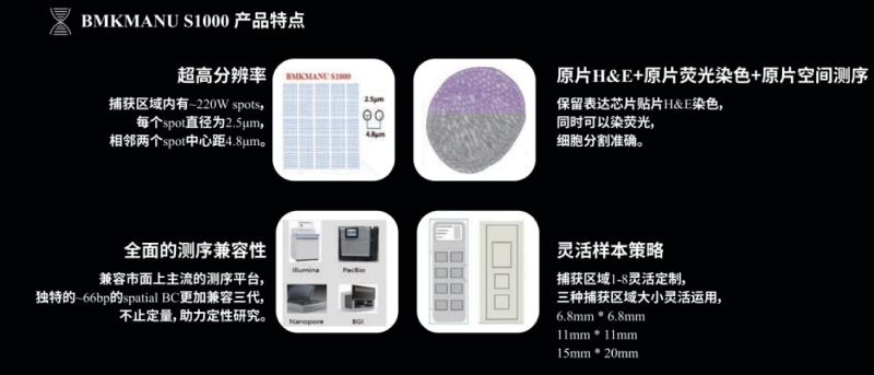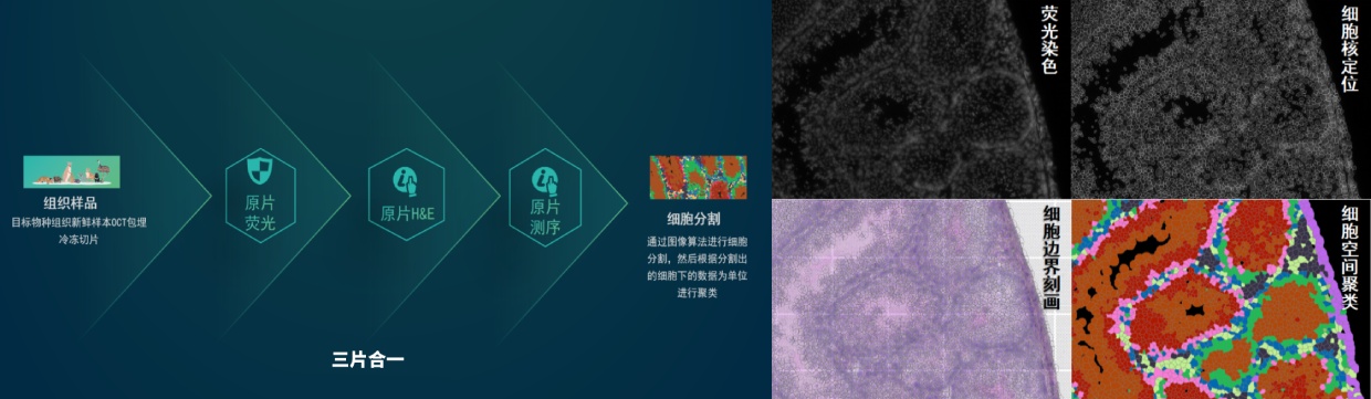 百創(chuàng)智造S系列空間轉(zhuǎn)錄組細(xì)胞分割實(shí)現(xiàn)原理: 三圖合一 百創(chuàng)智造基于S系列空間芯片的底層設(shè)計(jì),開發(fā)出了自己的核心技術(shù),可以得到完全沒有錯(cuò)誤的原片熒光圖像以及H&E圖像且與芯片完全對(duì)齊。基于熒光進(jìn)行細(xì)胞核的定位刻畫細(xì)胞核的邊界;基于HE的校準(zhǔn)輔助刻畫細(xì)胞的邊界,通過邊界信息映射到芯片上,提取相應(yīng)位置的測序數(shù)據(jù),實(shí)現(xiàn)精準(zhǔn)的單細(xì)胞分割。