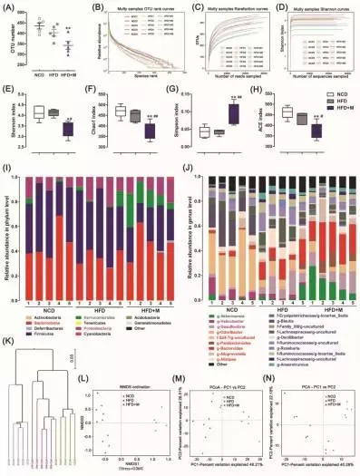 4)?UPGMA、NMDS、PCA、PCoA分析,發(fā)現(xiàn)褪黑素顯著改變了腸道菌群的結(jié)構,如下圖K-N。