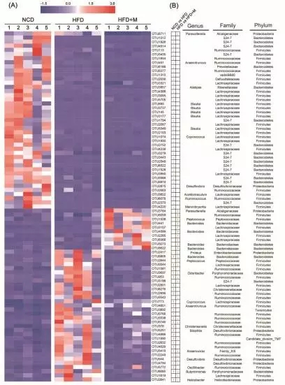1) ?如下圖顯示,在三個分組中一共找到85個相對豐度有顯著差異的OUT。與NCD組相比,HFD組有27個相對豐度顯著增高的OTU,42個顯著降低的OTU。與HFD組相比,添加了褪黑素的組有10個相對豐度顯著增高的OTU,20個顯著降低的OTU;而在這30個差異性的OTU中,有14個OTU的變化方向與和NCD組比較的結(jié)果完全相反。這14個OTU屬于Ruminococcaceae、Desulfovibrionaceae、Bacteroides、Porphyromonadaceae、Helicobacteraceae、Christensenellaceae,有研究表明這些微生物與肥胖相關。