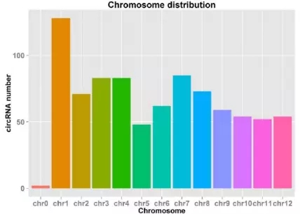 2.染色體來源分析發現,1號染色體產生的circRNA最多。