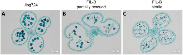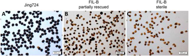 1、育性分析:FIL-B(育性不穩定系)分為育性部分恢復的植株和完全不育植株,本項目所構建的BC4群體462個子代中有14.9% 的植株為育性部分恢復的表型。育性部分恢復植株的花粉大小小于正常花粉,大于完全不育植株的花粉(Fig 1.)。經I2-KI染色后的不育花粉表現出形態的不規則和染色的異常(Fig 2.)。