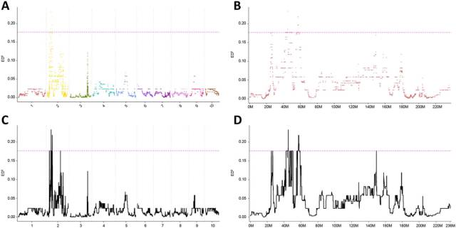 A: 各染色體上SNP的ED值; B: 2號染色體上SNP的ED值;C:各染色體上SNP經擬合后的關聯分析結果;B: 2號染色體上SNP經擬合后的的關聯分析結果,其中紅色的虛線代表閾值線(99百分位法計算得到),黑色的實線代表擬合曲線