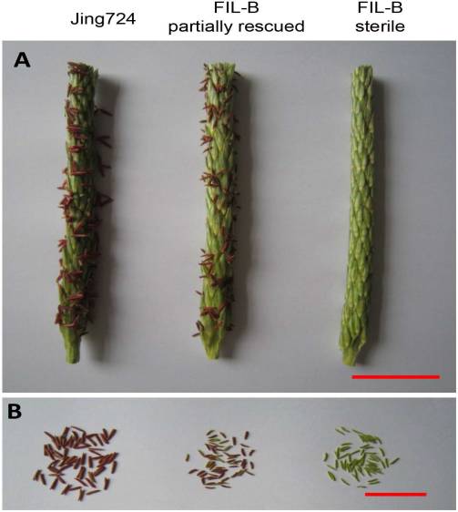 A:Jing724 和FIL-B (育性不穩定系,包括育性部分恢復植株和完全不育植株) 在抽穗6天后的穗;B: A圖中各植株穗上的花粉. 其中紅色的標尺代表 3 cm