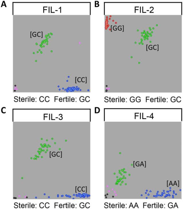 本研究選取BC4群體中50株育性部分恢復植株和50株不育植株,分別提取DNA,對候選的兩個蛋白基因共4個SNP位點進行KASP驗證,發現在不同的表型下會出現不同的基因型,再次暗示這兩個基因很可能是與育性不穩定相關。