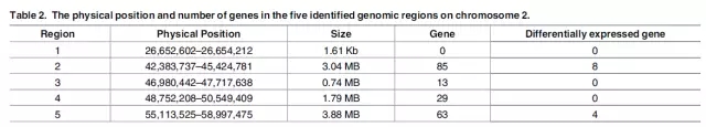 4、BSR關聯分析:與參考基因組比對后,F池和S池分別獲得171,594和 170,820個 SNP,選取混池間差異的SNP位點,進行ED關聯分析,共得到5個候選區域(Fig 4.),結合數據庫注釋結果及轉錄組差異基因的結果,最終獲得12個候選基因(Table 2、Table 3)。