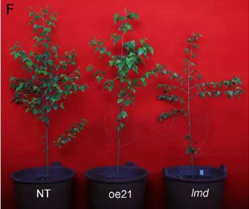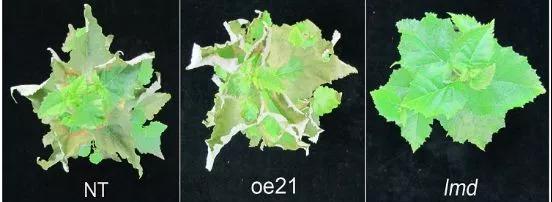 轉錄組材料為lmd、oe21、NT,lmd突變體是從BpGH3.5轉基因株系中分離出;oe21株系是正常的BpGH3.5轉基因株系;對照材料是非轉基因的NT。