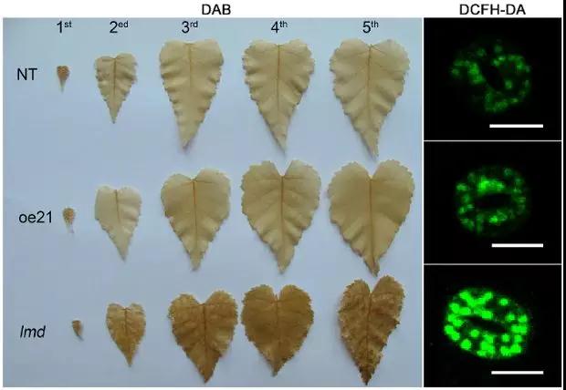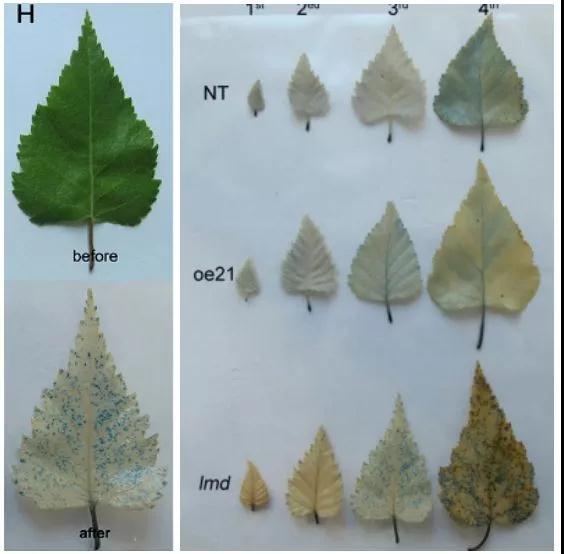作者在研究BpGH3.5在樺樹中的功能時偶然獲得了lmd突變體。構建的21株OE-GH3.5株系中,唯獨lmd葉片表現出壞死斑點并伴有早衰的現象。這很明顯是一種病變的表現,當這種情況出現,很顯然我們要思考兩個問題:
