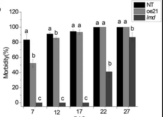 研究發現類病變突變體增強了對病原菌的抗性,為了測試lmd突變體是否對Alternaria alternata有抗性,作者將孢子懸浮液噴灑在NT、oe21和lmd幼苗上。7天之后,NT和oe21感染嚴重,出現了幾片枯萎葉片,而在lmd突變體中觀察到的枯萎葉片很少,盡管其葉片上有許多病變(圖11)。噴施17天后,NT和oe21的發病率均在90%以上,但lmd仍未出現感染葉片。lmd的發病時間出現在噴灑后22天,而此時,lmd的發病率為45.55%,但NT和oe21的發病率均為100%(圖12)。