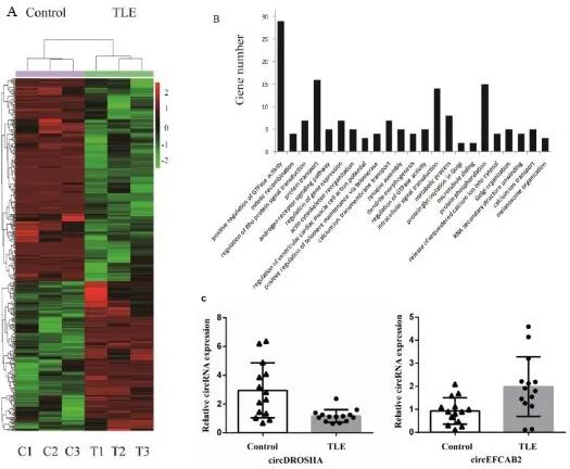 在本研究中,為了評估circRNA在人體內的作用,作者采用了高通量測序方法,測定TLE患者和非TLE患者顳葉新皮質中circRNA表達水平,并對環狀RNA的功能進行了注釋。作者描述了一個包含潛在基因與circRNA-miRNA的網絡。