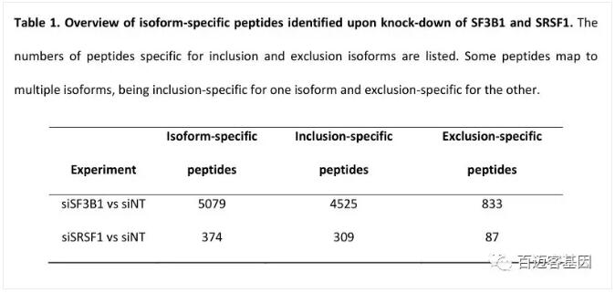 在siSF3B1和siSRSF1的差異剪接結果中,分別確定了5079和374個isoform特異肽段(如表1所示)。