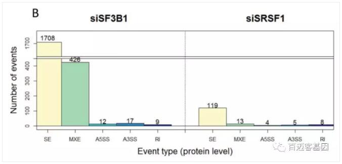 轉錄組分析顯示siSF3B1和siSRSF1的可變剪接事件與對照組相比有顯著差異(圖3A),證明對剪接因子的操作導致了差異剪接的產生。