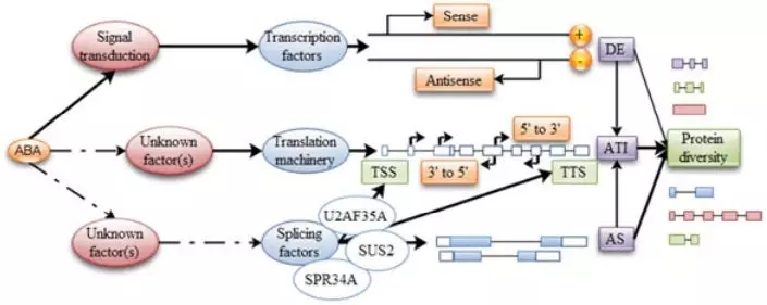 FY Zhu[3]等通過(guò)轉(zhuǎn)錄組和蛋白組的聯(lián)合分析揭示了擬南芥在脫落酸響應(yīng)中的可變剪接和翻譯的分子機(jī)制,結(jié)果中發(fā)現(xiàn)相比于基因的差異表達(dá),發(fā)生差異可變剪接的基因功能多集中在三羧酸循環(huán)、光合作用等途徑,表明在對(duì)ABA響應(yīng)中,相對(duì)基因表達(dá),轉(zhuǎn)錄本的結(jié)構(gòu)變化可能起更為重要的作用,且差異可變剪接事件更容易翻譯成蛋白行使生物學(xué)功能。