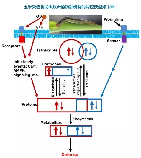 Qi J[4]等,利用多組學(xué)(轉(zhuǎn)錄組學(xué)、蛋白組學(xué)、代謝組學(xué))技術(shù),探索了玉米受植食昆蟲(chóng)攻擊的防御機(jī)制,并構(gòu)建繪制了系統(tǒng)的調(diào)控模型。這些數(shù)據(jù)對(duì)玉米防御昆蟲(chóng)災(zāi)害的進(jìn)一步遺傳學(xué)研究搭建了很好的框架,也為抗昆蟲(chóng)災(zāi)害的玉米新品種的培育奠定了良好的基礎(chǔ)。