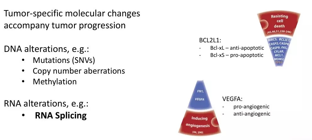 另外一個(gè)結(jié)腸癌標(biāo)志物相關(guān)的研究中,Malgorzata A Komor等[8]通過(guò)整合RNA-seq、Iso-seq及LC-MS/MS數(shù)據(jù)建立了一個(gè)適于臨床研究的蛋白組數(shù)據(jù)分析流程,從分析結(jié)果中可以發(fā)現(xiàn)除了DNA水平上的變異,RNA水平上發(fā)生的異常剪接也會(huì)導(dǎo)致癌癥的發(fā)生發(fā)展,比如在結(jié)直腸癌(CRC)中,SRSF1導(dǎo)致RAC1中exon 4的保留,產(chǎn)生了一種有助于癌細(xì)胞存活的Rac1b isoform;BCL2L1的可選擇性5 ‘ s端剪接事件的發(fā)生助于抵抗細(xì)胞死亡使;VEGFA的可選擇性3 ‘端剪接事件會(huì)導(dǎo)致癌癥中抗血管生成的isoform的轉(zhuǎn)變,并誘導(dǎo)血管生成。
