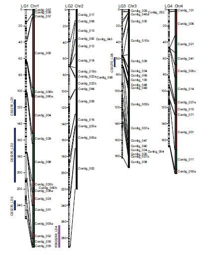 通過對CS3270和 RBG5266雜交而來的178個子代測序數據分析,構建出含有1512個marker的4條連鎖群,總圖距898cM,平均圖距0.59cM。依據遺傳圖譜,57個scaffold被明顯分群,共35.7M被組裝,11個scaffold共1.1M依據禾谷鐮刀菌序列組裝到基因組,22個scaffold共262kb長度不能被組裝至基因組。對其功能注釋,冠腐病菌中預測到了12447個基因,其中含有FpDLH1等毒性基因。