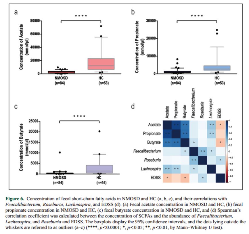 從上述研究發(fā)現(xiàn),NMOSD患者腸道中缺乏合成SCFAs的菌群,但引起該患者癥狀的機會致病菌大量繁殖。因此,本文運用GC技術(shù)研究NMOSD與HC人群腸道SCFAs(醋酸纖維、丙酸鹽和丁酸鹽),結(jié)果發(fā)現(xiàn),NMOSD患者的3種SCFAs濃度均顯著低于HC人群(p<0.001)(圖 6a-c)。非參數(shù)相關(guān)性分析(Spearman)表明(圖 6d)),SCFAs(醋酸纖維、丁酸鹽)濃度分別與EDSS顯著負(fù)相關(guān)(p<0.05);特異性產(chǎn)SCFAs細(xì)菌(毛螺旋菌Lachnospira)豐度與SCFAs濃度顯著正相關(guān)。此外,mmf、azathioprine及其他免疫抑制治療劑對SCFAs濃度的影響存在差異。