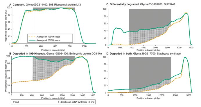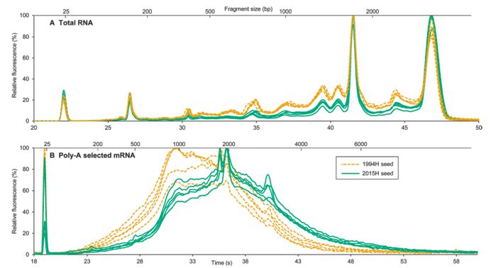 在相隔21年的種子的胚軸中比較mRNA的降解,2015H和1994H分別顯示未衰老和增加衰老癥狀。使用全分子cDNA無打斷的測序方法對RNA進行測序。發(fā)現(xiàn)一些轉(zhuǎn)錄本在兩個群組中均有降解,但在1994H種子的組織中觀察到更多的損傷。損傷主要由于片段碎裂造成,如電泳圖譜的變化,轉(zhuǎn)錄本覆蓋長度和測序深度所示。幾乎沒有證據(jù)表明轉(zhuǎn)錄本丟失或引起了氧化損傷。降解轉(zhuǎn)錄本中片段大小的連續(xù)分布以及轉(zhuǎn)錄本長度和降解之間的正相關(guān)支持了通過隨機片段化造成mRNA降解的假設(shè),這與氧化事件引起死亡的假設(shè)一致。