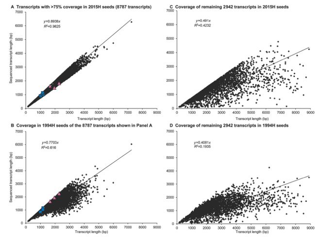 種子的壽命有限,主要取決于物種,生長條件和儲存環(huán)境。當種子處于脆弱的狀態(tài)時,無法修復機體遭受的化學降解,這會使種子慢慢老化并最終導致死亡。在種子老化機制涉及的生物分子中,已經(jīng)檢測干燥儲存的種子總RNA的降解與活力喪失同時發(fā)生。為了鑒定mRNA的特異性變化,該研究采用新的Nanopore全長轉(zhuǎn)錄組測序技術(shù)檢測了大豆(Glycine max)種子的轉(zhuǎn)錄組。