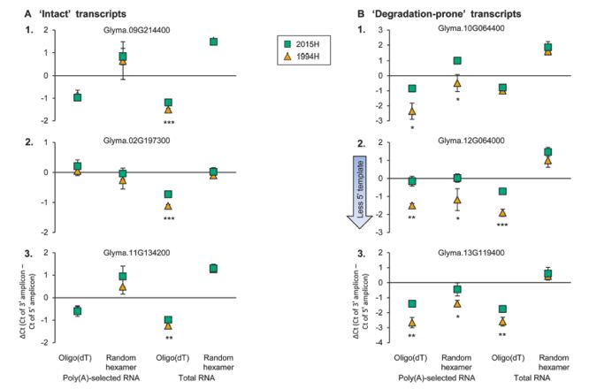 通過qPCR的方法對區(qū)域A(無降解)的三種轉(zhuǎn)錄本和區(qū)域B的三種轉(zhuǎn)錄本(僅在1994H種子組織中顯著降解)的完整性進行驗證,結(jié)果顯示:區(qū)域A的轉(zhuǎn)錄本,在組內(nèi)cDNA文庫中5’和3’擴增的cDNA模板相似,且三個cDNA文庫ΔCt值沒有差異,樣本2015H和1994H之間有較小差異。與完整轉(zhuǎn)錄本相反,對于易于降解的轉(zhuǎn)錄本,ΔCt值在群組之間顯著不同(區(qū)域B)。在1994H樣品中,5’比3’擴增模板豐度低,產(chǎn)生負ΔCt值,在2015H樣品中,兩種擴增模板豐富度相似。